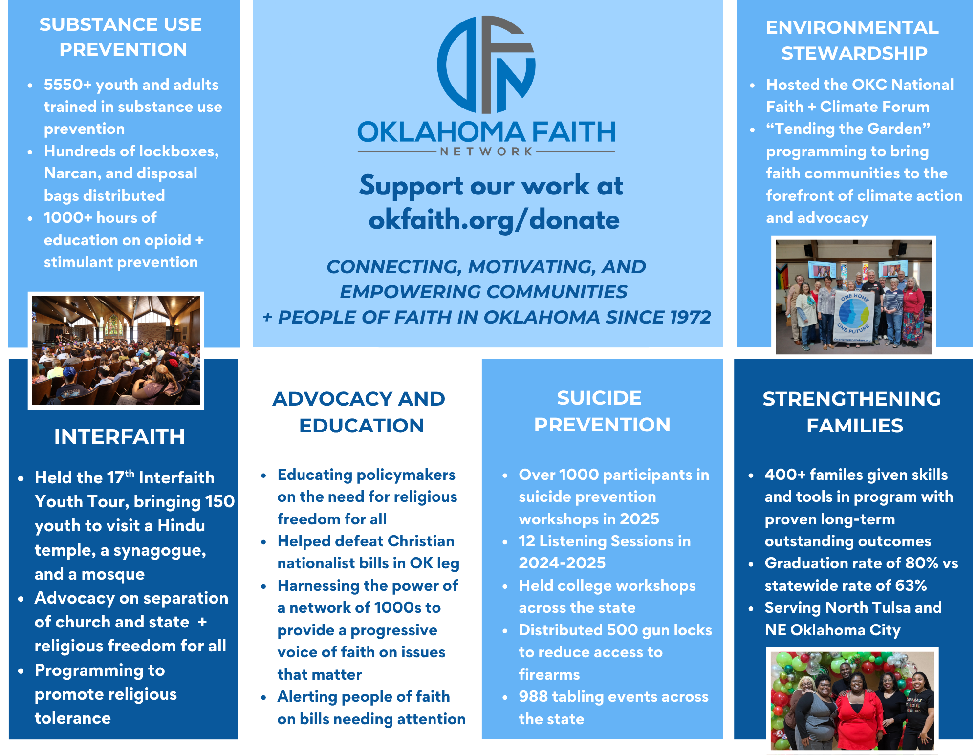 We are a statewide interfaith coalition serving communities since 1972 across Oklahoma. We believe the full faith community—across traditions and backgrounds—can work together to build deeper understanding, strengthen mutual respect, and create meaningful change where we share common ground and purpose.