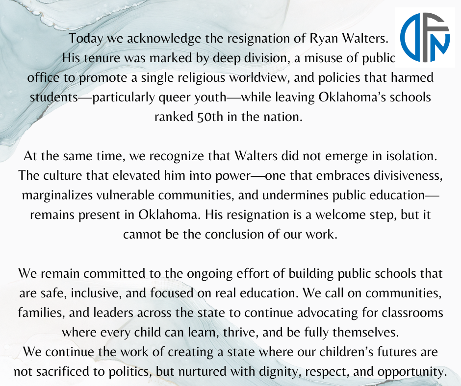 Today we acknowledge the resignation of Ryan Walters as Oklahoma State Superintendent of Public Instruction. His tenure was marked by deep division, a misuse of public office to promote a single religious worldview, and policies that harmed students—particularly queer youth—while leaving Oklahoma’s schools ranked 50th in the nation. His leadership prioritized political ambition over the wellbeing of our children and educators, and our state is better served by his departure.